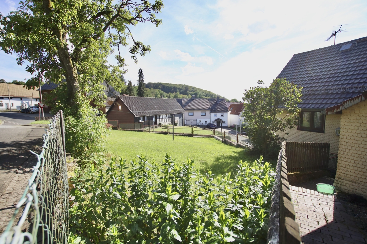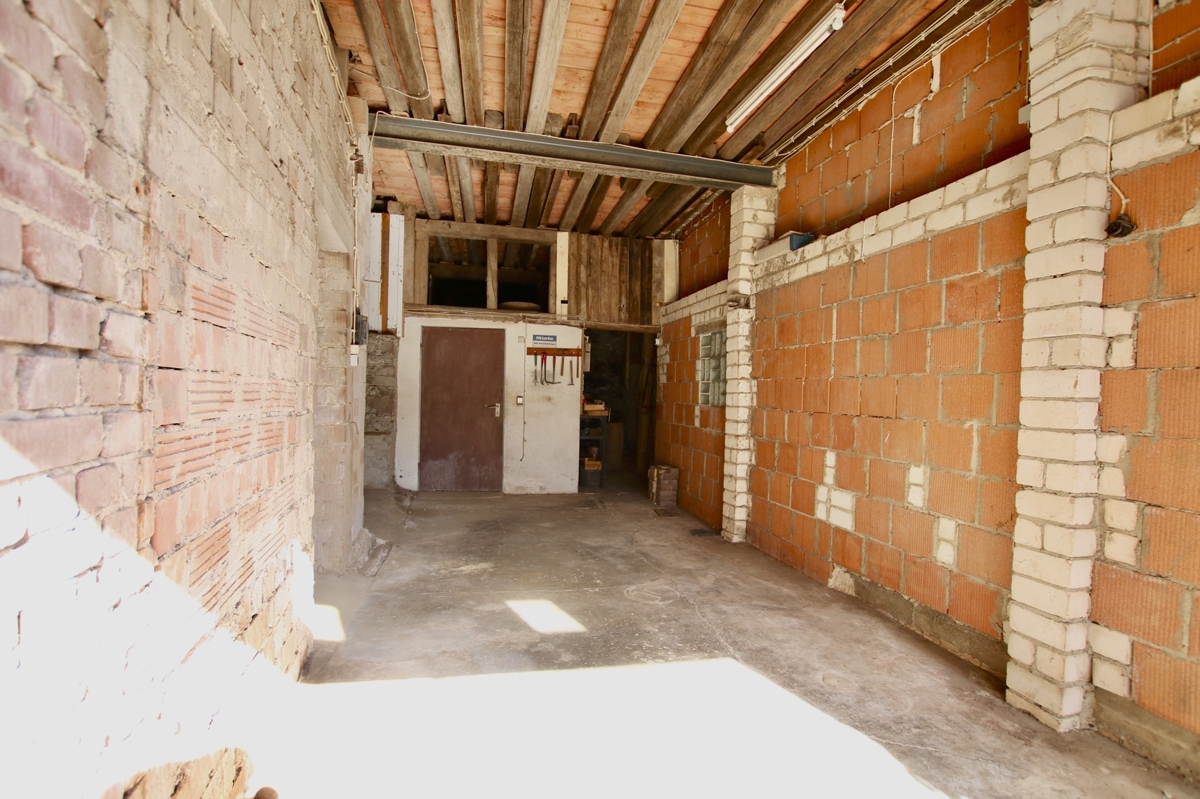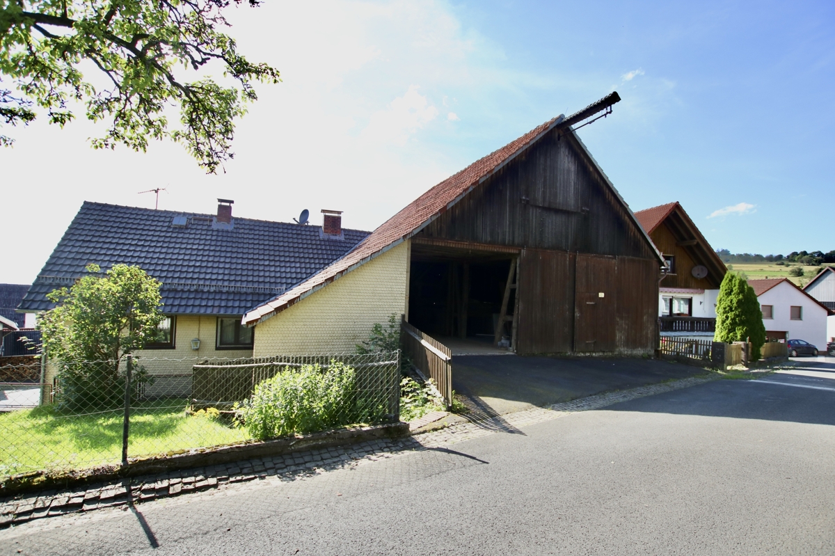 Zum Wohnhaus gehören eine große Scheune, die von zwei Seiten befahren werden kann und die ehemaligen Stallungen. Die in U-Form angelegten Gebäude rahmen einen mit Blaubasalt gepflasterten Hof ein. Auf dem ca. 800 m2 großen Grundstück gibt es außerdem einen Garten.